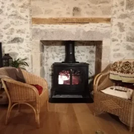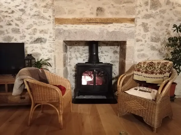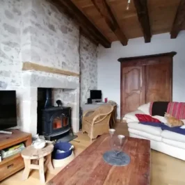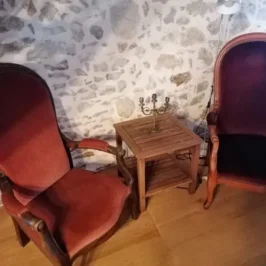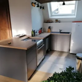 You enter into a large, pleasant 50m2 room with lounge and dining table. A new kitchen and wood-burning stove have been installed. This room has 2 original antique wardrobes. The staircase leads to 2 bedrooms, a bathroom with shower and bath and a separate toilet.