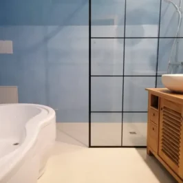 The bathroom has a rain shower, bath and two natural stone washbasins.