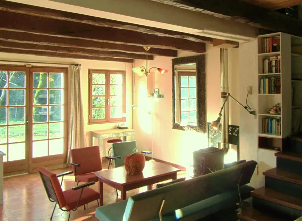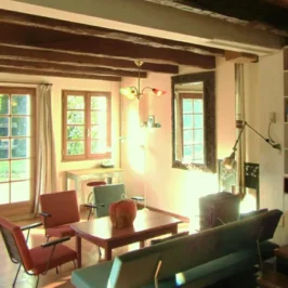 Maison charmante entièrement indépendante, vue dégagée sur terrassements, pré, foret, plage de galets. RdC: pièce de vie unique spacieuse, poêle à bois, cuisine équipée, meublée pour 6, sur demande pour bébé, enfant. Portes fenêtres donnant sur terrasse au sud, à moitié abritée, avec BBQ en pierres, salon de jardin, parasol, arbres. Salle d'eau avec douche, WC, lavabo, lave- linge, frigo. A l'étage: 1 palier et 2 chambres spacieuses avec lucarnes et balcon, 5 lits à placer librement, 1 lit alcôve.
