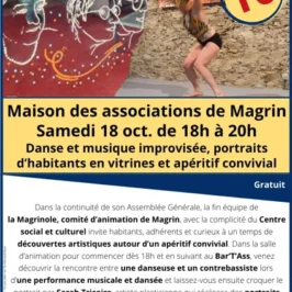 Dans la continuité de son Assemblée Générale, la fine équipe de la Magrinole, comité d’animation de Magrin, avec la complicité du Centre social et culturel invite habitants, adhérents et curieux à un temps de découvertes artistiques autour d’un apéritif convivial.Dans la salle d’animation pour commencer dès 18h et en suivant au Bar’T’Ass, venez découvrir la rencontre entre une danseuse et une contrebassiste lors d’une performance musicale et dansée et laissez-vous croquer le portrait par Sarah Tricoire, artiste plasticienne qui réalisera des portraits d’habitants sur les vitrines de cette maison qui leur est dédiée.