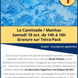 Dans tous les cas ce n’est pas Sarah Tricoire, artiste plasticienne à la bonne humeur contagieuse qui vous initiera à la gravure sur… Tetra Pack ! Vous repartirez chez vous avec de belles réalisations et porterez désormais un tout autre regard sur vos briques de lait !