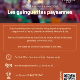 Chaque premier mercredi du mois, les guinguettes paysannes s’organisent à Tayrac, au sein de la ferme Phacelia & cie : un marché de producteurs locaux et des animations gratuites ouvertes à tous. Un repas de clôture est proposé à prix libre.
