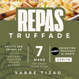 20h30 repas : soupe, truffade, saucisse, salade, dessert