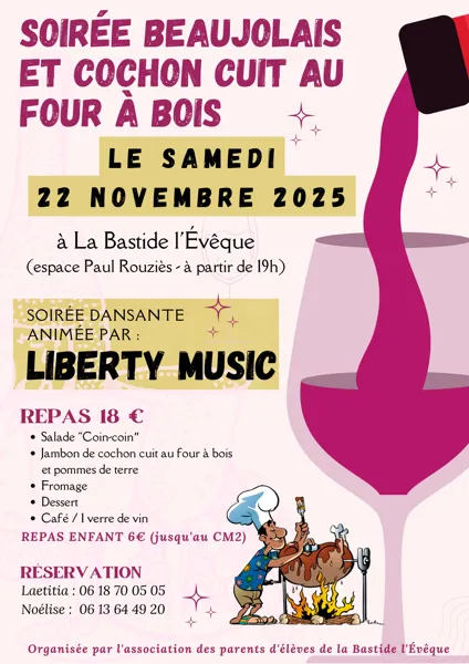 Vous cherchez une soirée mémorable pour fêter l'arrivée du beaujolais nouveau ? Ne cherchez plus, l'APE de la Bastide l'Évêque vous invite à notre soirée Beaujolais avec un délicieux repas cochon cuit au feu de bois !