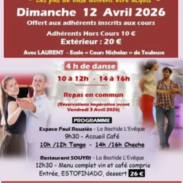 Avec Laurent : 10h /12h Tango - 14h /16h ChaCha Offert par l’association aux adhérents de nos cours. Ouvert aux danseurs non adhérents. Repas en commun possible au Restaurant Souyri sur réservation impérative avant le 3 Avril.