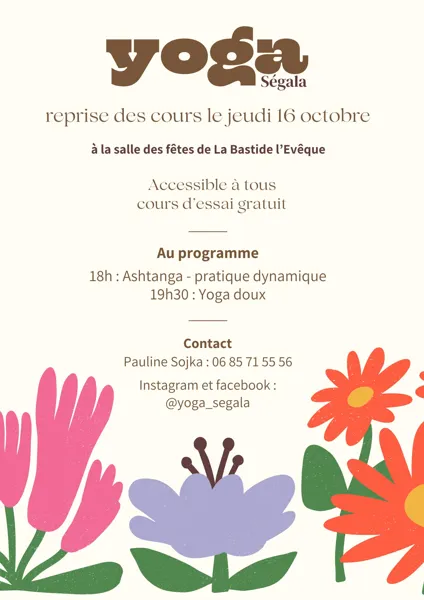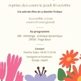 2025/2025 : Cours de yoga les jeudis à partir du 16 octobre 18h YOGA ASHTANGA 19h30 YOGA DOUX 1er cours gratuit à la salle polyvalente (espace Paul Rouziès)